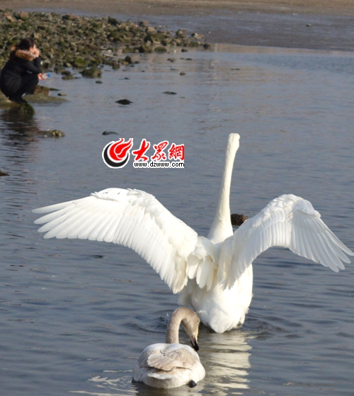 “冬天來(lái)榮成看天鵝,已經(jīng)是很多外地游客的習(xí)慣了。城鐵開(kāi)通以后,來(lái)的人數(shù)會(huì)越來(lái)越多,下了城鐵去看大天鵝,只有半個(gè)小時(shí)的路程!币贿厼⑾掠衩琢,一邊欣賞著上百只天鵝,晃動(dòng)著優(yōu)美的脖頸大快朵頤。一位當(dāng)?shù)貪O家宴老板,自豪地對(duì)大眾網(wǎng)記者說(shuō)。