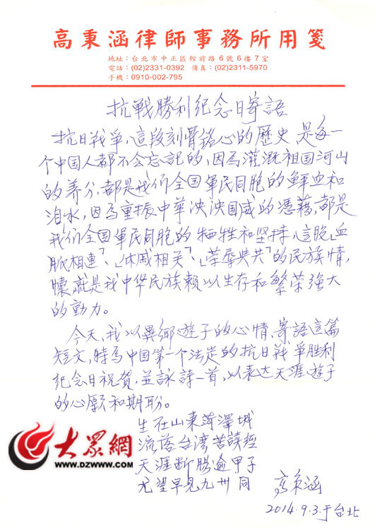 高秉涵寄語抗戰(zhàn)勝利紀(jì)念日。