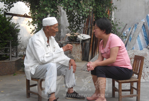 頭戴穆斯林白帽,身著白衣的回民支隊(duì)抗戰(zhàn)老兵蘭兆法向大眾網(wǎng)記者講述抗戰(zhàn)往事。大眾網(wǎng)記者攝