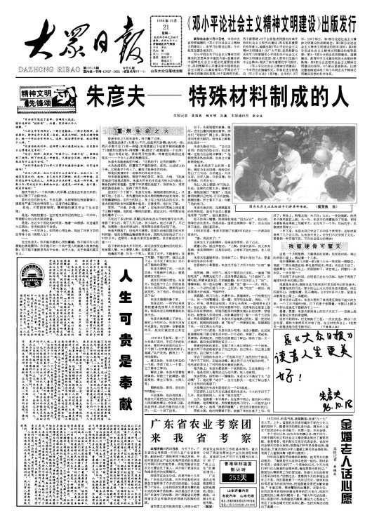 1996年,本報頭版頭條刊發(fā)朱彥夫事跡報道。