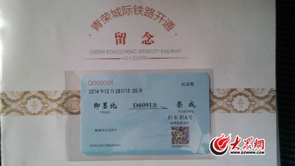 大眾網(wǎng)記者剛剛拿到青榮城鐵首發(fā)列車——D6091次列車紀(jì)念版車票。根據(jù)濟(jì)南鐵路局發(fā)布的鐵路運(yùn)行圖,青榮城際鐵路將開行11對(duì)動(dòng)車組列車,其中直通G字頭列車3對(duì),分別為榮成—上海虹橋高速動(dòng)車組列車1對(duì) ,煙臺(tái)—北京南高速動(dòng)車組列車1對(duì) ,榮成—北京南高速動(dòng)車組列車1對(duì) ;同時(shí)開行管內(nèi)D 字頭列車8對(duì) ,分別為濟(jì)南(濟(jì)南西)—榮成高速動(dòng)車組列車4對(duì) ,濟(jì)南—煙臺(tái)高速動(dòng)車組列車1對(duì),榮成—即墨北高速動(dòng)車組列車3對(duì)。