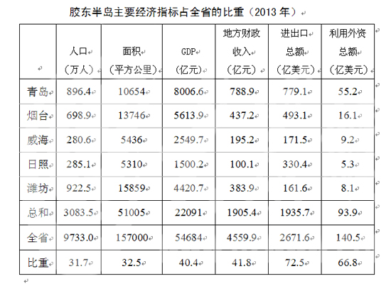 作為中國第一大半島的膠東半島,是山東經(jīng)濟實力最強、開放型經(jīng)濟水平最高、發(fā)展活力足、科研力量較為雄厚的地區(qū)。山東宏觀經(jīng)濟研究院經(jīng)濟研究所所長高福一介紹,2013年,膠東半島五市,以不足1/3的人口和面積,創(chuàng)造了均超過五分之二的地區(qū)生產(chǎn)總值和地方財政收入,而且進出口總額接近3/4,利用外資超過2/3。