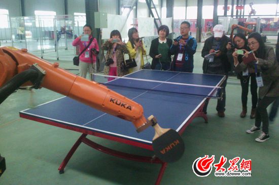 10月29日下午,“聚焦‘一圈一帶’——第十屆中國(guó)網(wǎng)絡(luò)媒體山東行”采訪團(tuán)來(lái)到山東諾博泰智能科技有限公司,走進(jìn)奇妙的“機(jī)器人世界”。圖為能打乒乓球的機(jī)器人引起記者們的圍觀。記者 王宗陽(yáng) 攝