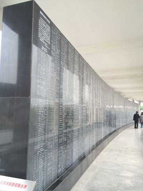 這里有一面全世界最震撼的墻,無數(shù)的大理石碑集合成四塊巨大的碑林墻,墻體兩側(cè),銘刻著濱州老鄉(xiāng)們能夠查找到的五萬五千三百零八個烈士的名字。導游的小姑娘告訴我們,這份名單肯定不全,說不定翻一倍不止,但是我們條件有限,那么動亂的年代,也就只收集到了這些人的名字、職務(wù)、犧牲地。說著,她用手指著不遠處彎腰看碑文的一個老大爺,說這地方經(jīng)常有人前來祭奠。
