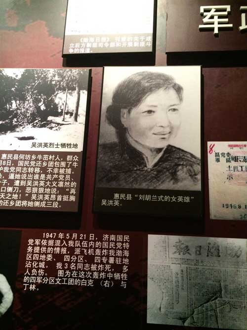 五萬五千三百零八個,夠多了吧?可實際上,為了支援這些已經(jīng)犧牲的,和那些還在繼續(xù)戰(zhàn)斗的戰(zhàn)士,濱州作為大后方,老百姓們還要出軍糧,幫忙養(yǎng)傷員,人背肩扛,用獨輪車組成特色的后勤體系……請注意,這里不是大山大川,這里是一望無際的平原,這里很多土地都是鹽堿地,也長不出茂密的森林,在這樣的條件下,能夠頂住日本鬼子左一年右一年的掃蕩掃蕩再掃蕩,是談何容易的事情。更何況,我們這邊又從來都不缺漢奸,太平盛世如當下,還有數(shù)不清的公知再變相賣國,想當年能缺這種人嗎?整個參觀過程,印象最深刻的是偽軍還鄉(xiāng)團,瘋狂反撲的時候,真的就把我們的革命群眾當街拉出來,用鍘刀鍘成三四段。我看介紹上寫的是“劉胡蘭式的女英雄”,仔細一問才知道,這位名叫吳洪英的女烈士,犧牲的時候,要比劉胡蘭還早一年多。就是為了保護我們革命事業(yè),寧死不屈,即便尸骨不全,也絕不反悔。