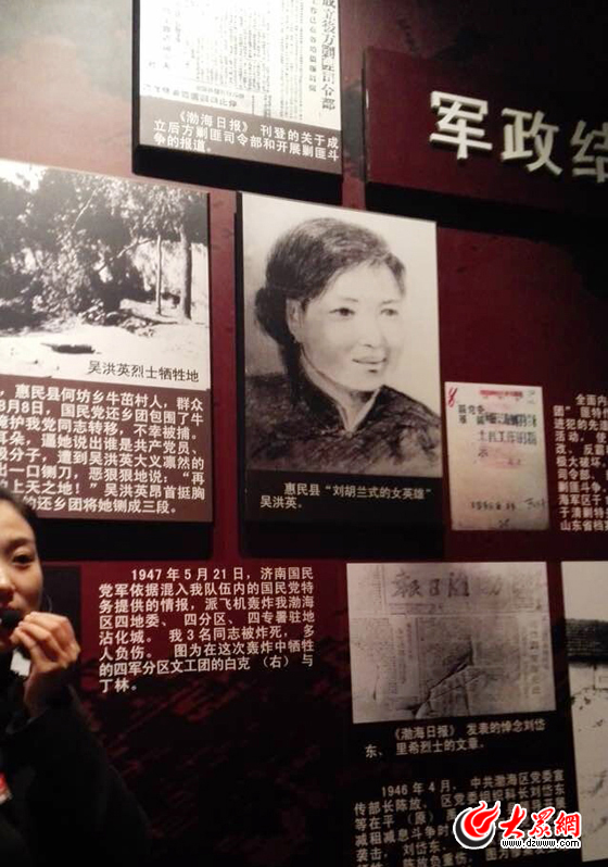 講解員徐徐敘述著那些年那些人那些事,那些血雨腥風中的浩然正氣,“老渤!本,是大寫的立體的,是一個又一個無私無畏的革命先烈們用鮮血書就的。它是山東省第一個農(nóng)村基層黨支部——壽光黨支部的星星之火;是山東省第一次農(nóng)民暴動——博興“八四”暴動的勇敢嘗試;是博興縣共產(chǎn)黨員李天佑為掩護向上級黨組織請示匯報工作的縣委聯(lián)絡員李相韓,自稱是“李相韓”而慷慨“替死”的悲壯大義;是馮景恩被捕后執(zhí)行槍決居然三槍未死,被群眾救回康復后毅然重新投入抗日救國事業(yè)的執(zhí)著不悔;是一馬三司令,馬氏三兄弟先前仆后繼抗日救國、為國捐軀的壯懷激烈;是大生產(chǎn)運動時,渤海區(qū)人民生產(chǎn)自救的自強不息;是渤海人民依托青紗帳作掩護,跟日本鬼子進行斗爭的艱苦卓絕;是尹洪英送郎參軍,“好父母教兒拿起槍,好妻子送郎上戰(zhàn)場”的無怨無悔;是樂陵縣常大娘帶領全家挖地道、地洞,先后掩護60多名黨政干部的機智淡定;是吳洪英為掩護我黨同志轉移,面對敵人的嚴刑拷打始終緊閉雙唇,最后在鍘刀下從容赴死的錚錚鐵骨;是解放戰(zhàn)爭期間,渤海區(qū)共抽調支前民工達81.9萬人次,有17.2萬名渤海區(qū)人民的優(yōu)秀子弟光榮參軍,喊出了“傾家蕩產(chǎn)、支援前線”的口號的渤海人共籌集軍糧10.45億斤的無私奉獻。一個個鮮活的生命一頁頁輝煌的革命史,渤海區(qū)的先烈們用可歌可泣的事跡闡釋著“老渤!本瘢`行著“老渤!本瘛