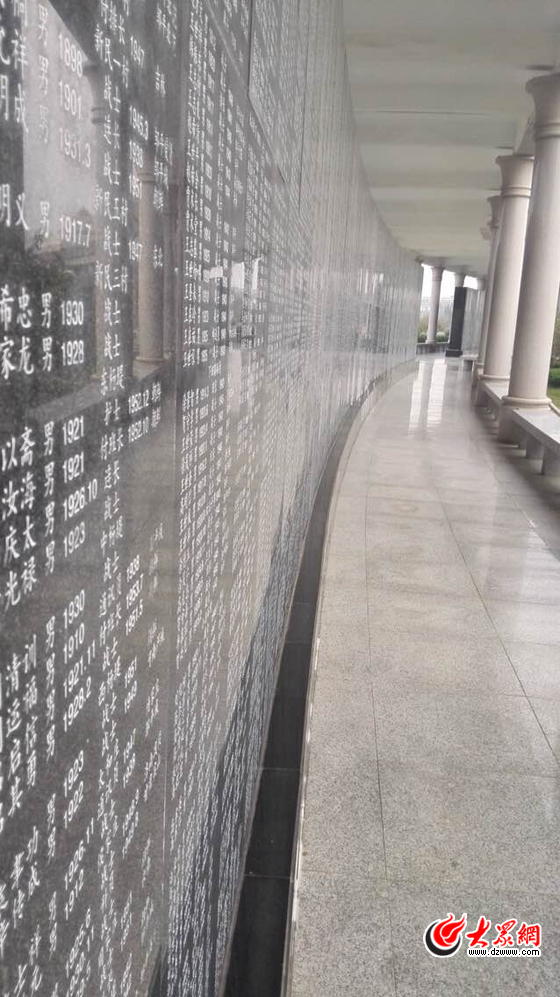 長達162米的渤海革命老區(qū)烈士英名錄碑廊,四大塊黑色大理石碑上密密麻麻地鐫刻著55308名烈士的名字以及他們的籍貫、職務和犧牲地點。