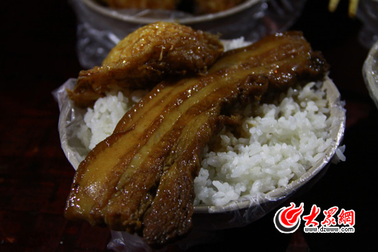 一到飯點兒,濟南街頭常常聽到三五好友這樣的對話:“走,我請客,大米干飯把子肉!”大家找一家味道正宗的小店或者地攤,則席而坐,一人面前擺兩個大碗,一碗是澆了肉湯的大米飯,一碗是盛了把子肉、面筋、雞蛋、炸豆腐的“硬菜”。