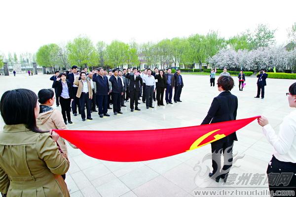 4月2日,德州市委辦公室、市委政研室、市農(nóng)工辦在德州革命烈士陵園開展黨的群眾路線教育實踐活動,廣大干部職工在黨旗下重溫入黨誓詞,向人民英雄紀念碑敬獻花籃,參觀德州人民英雄紀念館并瞻仰烈士墓。 記者鄒斌攝