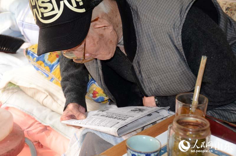 李玉柱今年95歲了,雖然下半身癱瘓,只有一只手能夠活動(dòng)自如,但是思維清晰,常常讀報(bào)看電視,圖為李玉柱老人正在看報(bào)紙。
