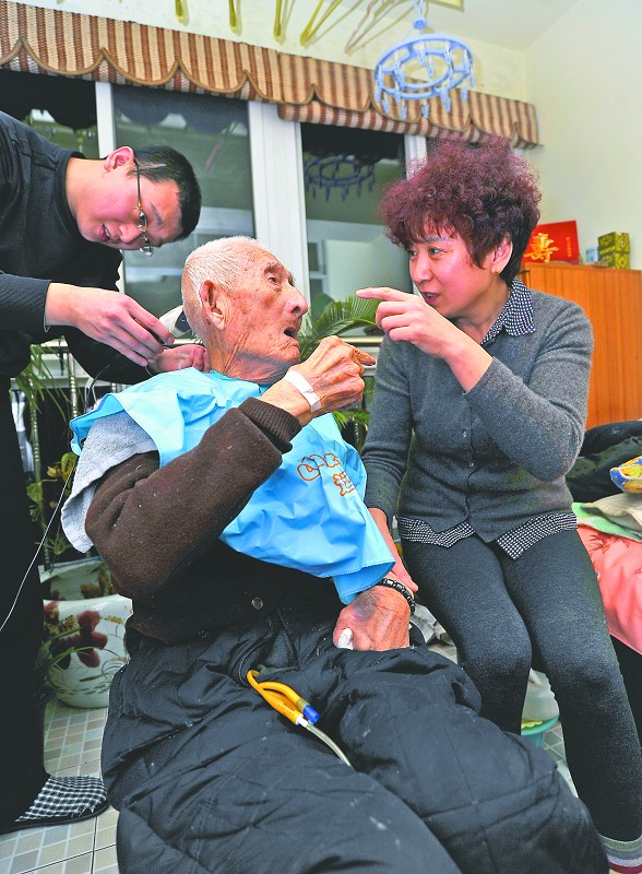27日晚飯后,房澤秋陪著96歲半身不遂的孤寡老人李玉柱聊天,兒子于霄寧忙著給老人理發(fā)。