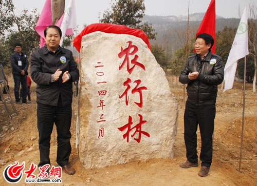 山東省委宣傳部副部長(zhǎng)劉致福(左一)和中國(guó)農(nóng)業(yè)銀行山東省分行副行長(zhǎng)鄭祖剛為“農(nóng)行林”揭幕。(記者 何泉峰 攝)