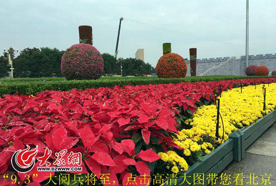 臨時(shí)觀禮臺(tái)南側(cè)和人民英雄紀(jì)念碑中間,是占地3000平方米的“長城烽火臺(tái)”主題花壇,其上分別立有“1945”和“2015”兩個(gè)年份。在“1945”的花壇上,有一群白鴿雕塑“飛向”2015年份,寓意世界和平。天安門廣場的東西兩塊綠地還布置有花柱、花球、長60米的花帶,人民英雄紀(jì)念碑周邊也用松柏花帶等圍起來。記者從現(xiàn)場工作人員處了解到,花卉布置景觀會(huì)延續(xù)至國慶黃金周后。