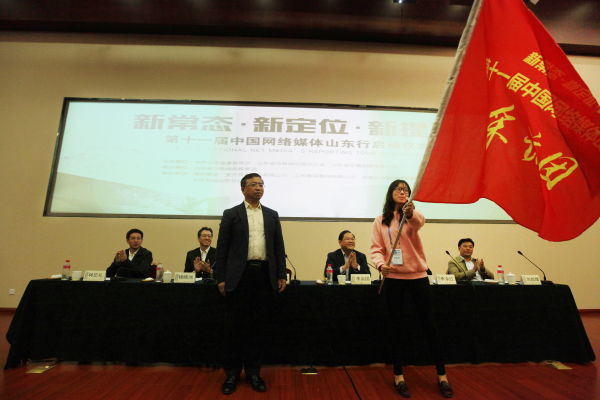 中共山東省委宣傳部副部長、山東省互聯(lián)網(wǎng)信息辦公室主任李建軍為采訪團授旗,采訪團成員代表孔唯千接旗,“新常態(tài)·新定位·新提升——第十一屆中國網(wǎng)絡媒體山東行”大型采訪活動正式啟動。