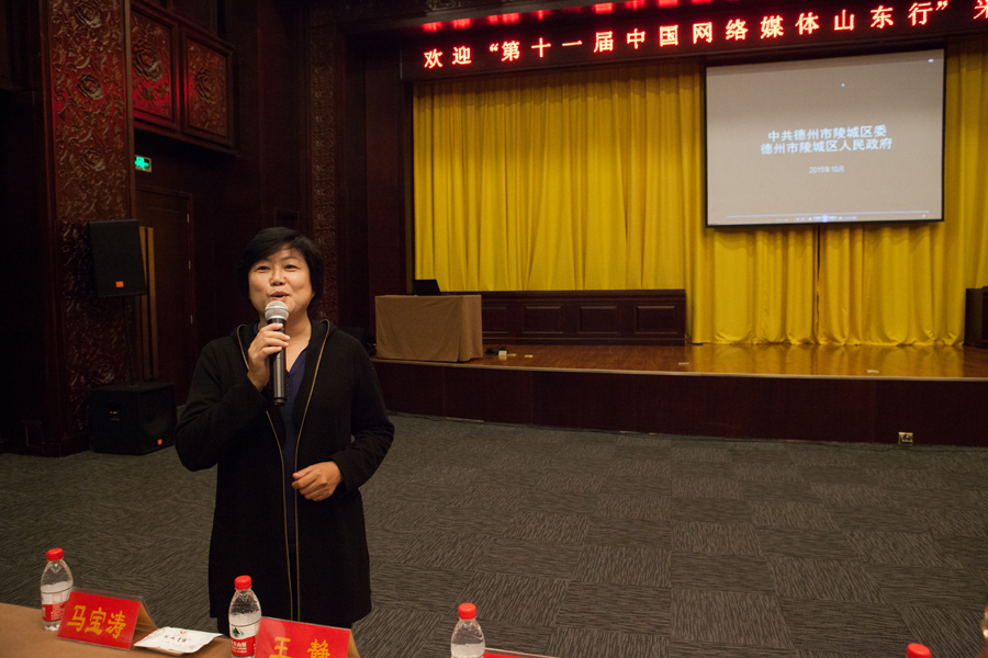 陵城區(qū)區(qū)委書記、區(qū)人大常委會主任馬俊昀向采訪團記者介紹陵城區(qū)發(fā)展情況(大眾網 撒偉 攝)