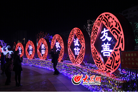 21日大年初三晚上,五蓮縣芙蓉廣場上點(diǎn)亮一片喜慶的紅色花燈。以“富強(qiáng)、民主、文明、和諧、自由、公正、法治、愛國、敬業(yè)、誠信、友善”標(biāo)語為基礎(chǔ)特別設(shè)計(jì)的花燈格外奪人眼球,標(biāo)語花燈中間的兩只白色山羊更是惟妙惟肖,引來市民爭相合影留念。