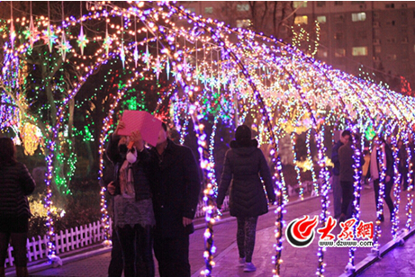 廣場西側(cè)是繁星點(diǎn)點(diǎn)的“星光大道”。五彩的小燈泡纏繞形成的通道十分夢幻。人們漫步其中,仿佛置身幻境。