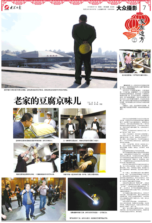 孫懷兵正在裝修的新餐廳正好在北京南站的正對面,這是他在北京開的第四家專做豆腐宴的餐廳。站在餐廳工地大樓的樓頂上,看著來來去去的列車,孫懷兵很自然地想起了家——鄒平縣西董街道辦事處孫家峪村。18年艱苦的北漂生活,是自己的家鄉(xiāng)最終眷顧了他,讓他的創(chuàng)業(yè)之路越走越平坦。