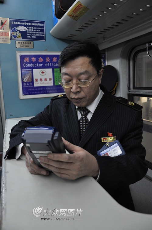 @大眾網(wǎng):2月18日18:19,列車從濟(jì)南東站開出后,李建國開始查票并為旅客辦理補(bǔ)票手續(xù)。