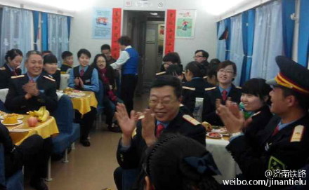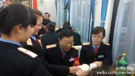 @大眾網(wǎng):2月18日20:30,聚餐前,大家請即將退休的李建國老師發(fā)表新春感言。李老師說:“今年是最后一個列車除夕,經(jīng)歷了四代列車,六次大提速,能為旅客服務(wù)這么多年,自己很知足也很滿足,感謝同事們多年來的關(guān)心,今年除夕將是自己人生經(jīng)歷中最難忘的一個。”