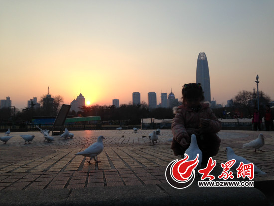 除夕傍晚,一個(gè)小女孩正在泉城廣場(chǎng)喂食和平鴿(大眾網(wǎng)記者韋輝 攝)