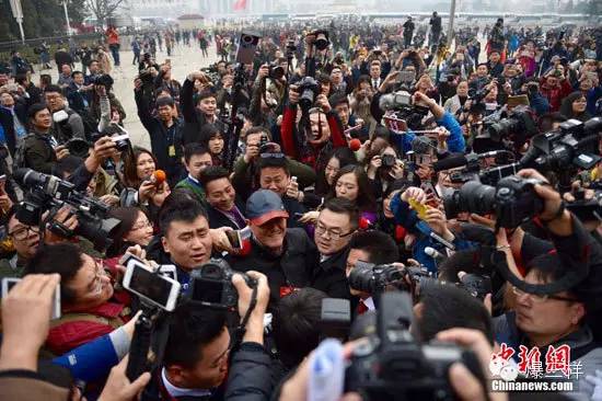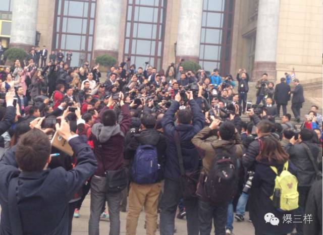 今天下午,距離全國(guó)政協(xié)十二屆四次會(huì)議開(kāi)幕還有一個(gè)小時(shí)的時(shí)候,人民大會(huì)堂東側(cè)廣場(chǎng)上早已聚集了包括樣哥(爆三樣微信號(hào):sdbaosanyang)在內(nèi)的3000多位記者,一會(huì)兒,將有2000多位委員從這些手持“長(zhǎng)槍短炮”的記者中間穿行而過(guò)。他們中有官員、軍人、大佬、明星、專家……其中,誰(shuí)將成為當(dāng)天的焦點(diǎn)人物,或許委員們與樣哥一樣,在下車(chē)的那一刻,心中依然忐忑!袄顝┖辏 14點(diǎn)25分,當(dāng)李帥哥出現(xiàn)的時(shí)候,現(xiàn)場(chǎng)的沉寂第一次被突然打破,當(dāng)時(shí)樣哥還尋聲四處找人,只見(jiàn)前方一團(tuán)人群迅速向樣哥奔來(lái),要說(shuō)走路的速度,李彥宏還真不比劉翔差,沒(méi)拍到正臉,樣哥只能含恨目送人群遠(yuǎn)去。李彥宏之后,姚明、鞏漢林、張國(guó)立、姜昆、俞敏洪等大多都遭遇了李彥宏相似的圍堵和追問(wèn)。不一會(huì)兒劉翔也來(lái)了,但他竟神奇地躲過(guò)了記者們的圍堵,悄悄地走進(jìn)了會(huì)場(chǎng)。按說(shuō)3000多記者盯著,不應(yīng)該又漏掉他呀?墒牵@次劉翔就像去年喊了一句“姚明來(lái)了!”一樣幸運(yùn),又有人替他出來(lái)解圍了。此人身穿黑色外套,頭戴深藍(lán)色帽子,一下車(chē)就被“逮”著了。