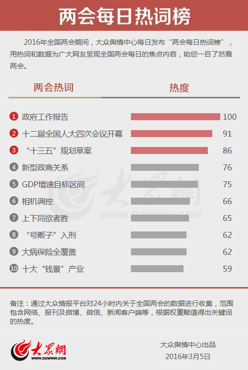 大眾網(wǎng)濟(jì)南3月5日訊(記者 劉欣 劉洪 宋瑋瑋)今天,大眾輿情中心發(fā)布第四期“兩會(huì)每日熱詞榜”!罢ぷ鲌(bào)告”“十二屆全國(guó)人大四次會(huì)議開幕”“‘十三五’規(guī)劃草案”分別以100、91和86的熱度位居前三。