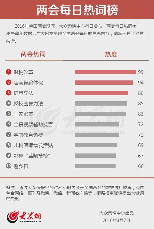 大眾網(wǎng)濟(jì)南3月7日訊(記者 劉欣王曉光 宋瑋瑋)今天,大眾輿情中心發(fā)布第六期“兩會(huì)每日熱詞榜”!柏(cái)稅改革”“落實(shí)帶薪休假”“信息立法”分別以99、94和86的熱度,成為今日最熱詞。