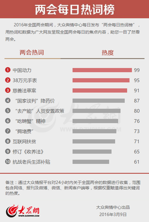 大眾網(wǎng)濟南3月9日訊(記者 宋瑋瑋 蘇桐)今天,大眾輿情中心發(fā)布第8期“兩會每日熱詞榜”!爸袊鴦恿Α薄38萬元手表”“慈善法草案”分別以99、95和91的熱度名列榜單三甲。