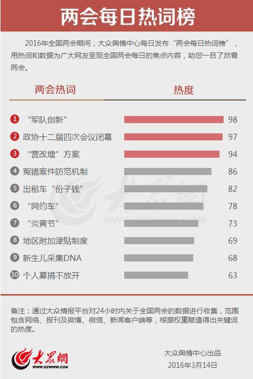 大眾網(wǎng)濟(jì)南3月14日訊(記者 王曉光 宋瑋瑋 劉洪)今天,大眾輿情中心發(fā)布第十三期“兩會每日熱詞榜”!败婈(duì)創(chuàng)新”“政協(xié)十二屆四次會議閉幕”“‘營改增’方案”分別以98、97和94的熱度成為今日最熱詞。