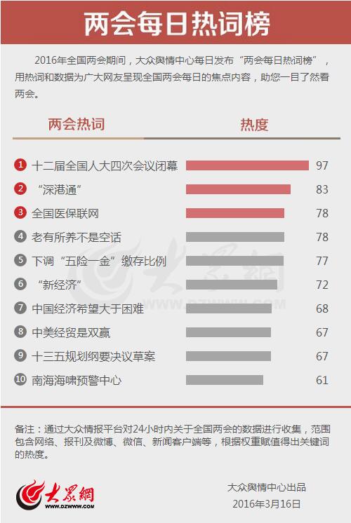 大眾網(wǎng)濟(jì)南3月16日訊(記者 王曉光 劉洪 宋瑋瑋)今天上午,第十二屆全國人民代表大會第四次會議圓滿完成各項議程,在人民大會堂勝利閉幕,本次大會審議并通過了十三五規(guī)劃綱要決議草案。在今天大眾輿情中心發(fā)布的第15期“兩會每日熱詞榜”上,“十二屆全國人大四次會議閉幕”“十三五規(guī)劃綱要決議草案”分別以97和67的熱度登上熱詞榜。