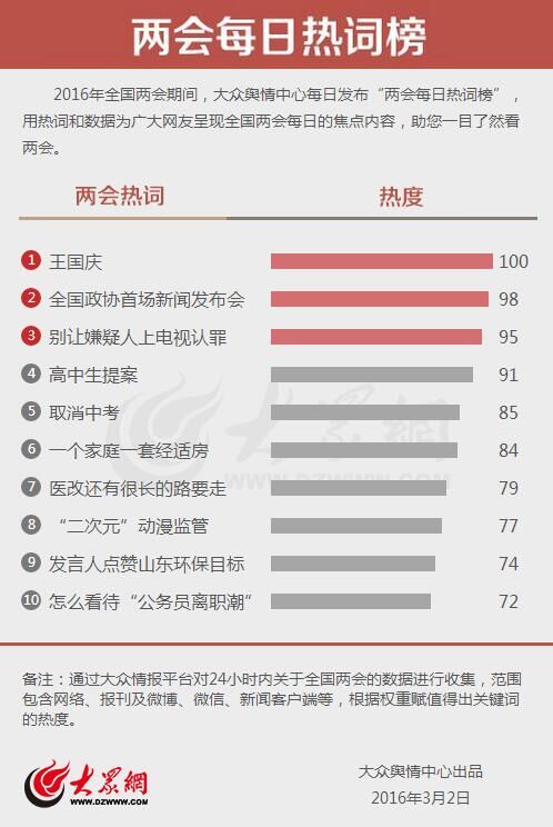 大眾網(wǎng)3月2日訊 (記者 劉欣 王曉光 宋瑋瑋)今天,大眾輿情中心發(fā)布第一期“兩會每日熱詞榜”!巴鯂鴳c”“全國政協(xié)首場新聞發(fā)布會”“別讓嫌疑人上電視認(rèn)罪”分別以100、98和95的熱度進(jìn)入熱詞榜前三名。