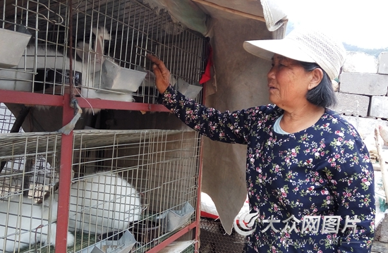 蒙陰縣舊寨鄉(xiāng)殷家?guī)X村的大山深處,71歲的徐美鳳老人看著飼養(yǎng)的36只長毛兔,每年能為她增收2500元左右。(記者 王宗陽 攝)