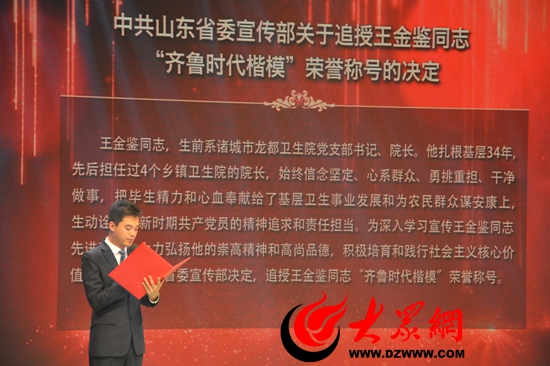 山東省委宣傳部追授諸城市龍都衛(wèi)生院原黨支部書記、原院長王金鑒同志“齊魯時(shí)代楷模”榮譽(yù)稱號(hào)。(記者 王宗陽 攝)