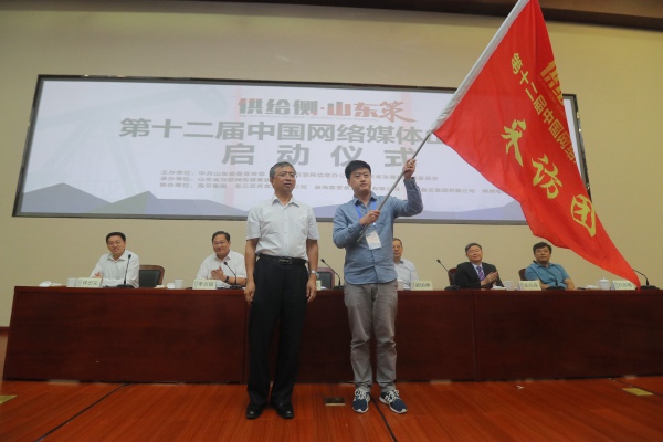 啟動(dòng)儀式上,中共山東省委宣傳部副部長(zhǎng)、山東省互聯(lián)網(wǎng)信息辦公室主任李建軍為采訪團(tuán)授旗,采訪團(tuán)成員代表人民網(wǎng)記者付長(zhǎng)超接旗,“供給側(cè)·山東策——第十二屆中國(guó)網(wǎng)絡(luò)媒體山東行”大型采訪活動(dòng)正式啟動(dòng)。