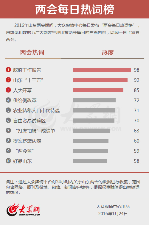 大眾網(wǎng)1月24日訊 (記者 劉欣 王曉光 宋瑋瑋)今天,大眾輿情中心發(fā)布第二期“兩會每日熱詞榜”!罢ぷ鲌蟾妗 “山東‘十三五’”“人大開幕”等熱詞分別以98、92、85的熱度位居前三。