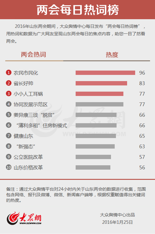 大眾網(wǎng)濟(jì)南1月25日訊(記者 劉欣 王曉光 宋瑋瑋)今天,大眾輿情中心發(fā)布第三期“兩會(huì)每日熱詞榜”。 “農(nóng)民市民化”“省長(zhǎng)好帥”“小小人工耳蝸”分別以96、83和77的熱度名列熱詞榜前三。