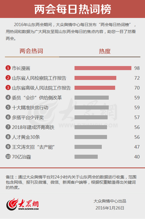 大眾網(wǎng)濟(jì)南1月26日訊(記者 劉欣 王曉光 宋瑋瑋)今天,大眾輿情中心發(fā)布第四期“兩會每日熱詞榜”!笆虚L漫畫”“山東省人民檢察院工作報告”“山東省高級人民法院工作報告”分別以98、72和70的熱度進(jìn)入熱詞榜前三名。