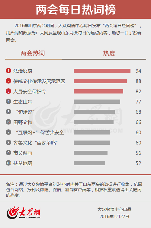 1月26日,山東省高級人民法院院長白泉民和山東省人民檢察院檢察長吳鵬飛向大會做的兩院工作報告受到了民眾的關注,報告中對懲治腐敗犯罪的總結匯報更是引發(fā)了輿論的熱議,“法治反腐”一詞以94的熱度登上今日熱詞榜榜首。此外,2015年山東法院工作創(chuàng)新亮點頻出,其中推進家事審判方式改革,探索實行“人身安全保護令”制度的舉措吸引了網友的關注,“人身安全保護令”以82熱度成為今日熱詞。