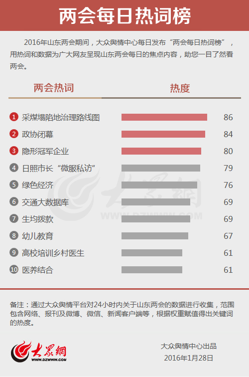 2016年山東兩會期間,大眾輿情中心每日發(fā)布“兩會每日熱詞榜”。通過大眾輿情平臺對24小時內(nèi)關于山東兩會的數(shù)據(jù)進行收集,范圍包含網(wǎng)絡、報刊及微博、微信、新聞客戶端等,用熱詞和數(shù)據(jù)為廣大網(wǎng)友呈現(xiàn)山東兩會每天的熱點內(nèi)容,助您一目了然看兩會。