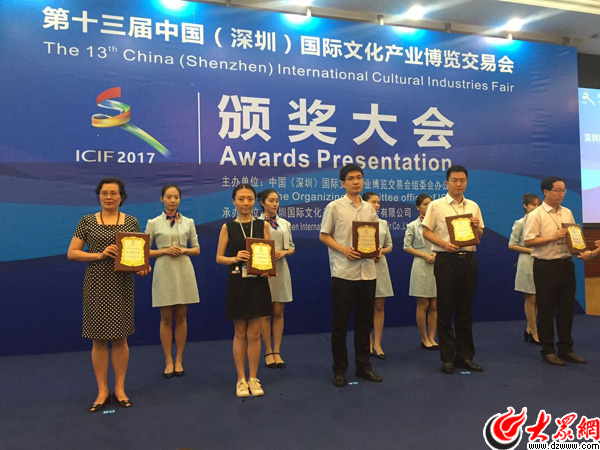 大眾網(wǎng)深圳5月15日訊 15日上午,第十三屆文博會(huì)頒獎(jiǎng)暨總結(jié)大會(huì)在深圳會(huì)展中心六樓桂花廳舉行。山東省委宣傳部、威海市委宣傳部、龍口市委宣傳部、濟(jì)寧市文化廣電新聞出版局等4家單位獲得優(yōu)秀組織獎(jiǎng);山東省展團(tuán)、威海市展團(tuán)、龍口市展團(tuán)、濟(jì)寧市展團(tuán)等4個(gè)展團(tuán)獲得優(yōu)秀展示獎(jiǎng);劉穎!洞芍奚选废盗刑沾蓜(chuàng)意作品,榮獲中國(guó)工藝美術(shù)文化創(chuàng)意獎(jiǎng)-金獎(jiǎng)。