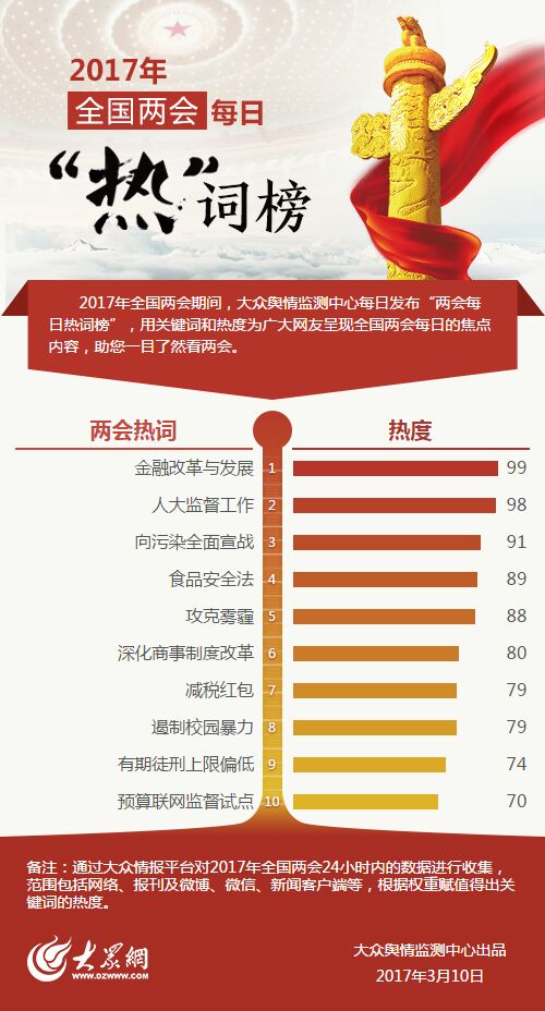大眾網(wǎng)3月10日訊 今天,大眾輿情監(jiān)測中心發(fā)布第八期“全國兩會每日熱詞榜”。“金融改革與發(fā)展”“人大監(jiān)督工作”“向污染全面宣戰(zhàn)”分別以99、98、91的熱度位居前三。