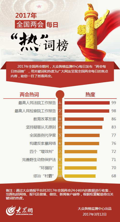 大眾網(wǎng)3月12日訊 今天,大眾輿情監(jiān)測(cè)中心發(fā)布第十期“全國(guó)兩會(huì)每日熱詞榜”。“最高人民法院工作報(bào)告”“最高人民檢察院工作報(bào)告”“教育改革發(fā)展 ”分別以99、98、86的熱度位居前三。