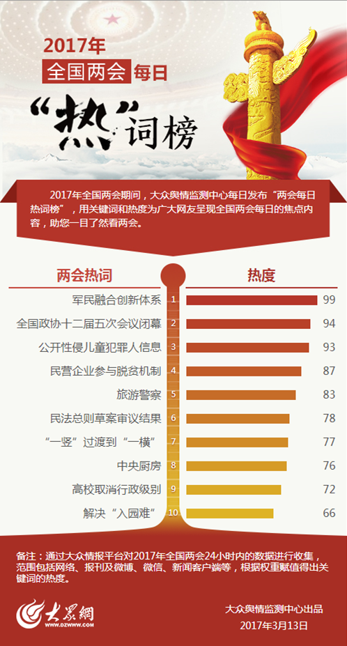 大眾網(wǎng)3月13日訊 今天,大眾輿情監(jiān)測中心發(fā)布第十一期“全國兩會(huì)每日熱詞榜”,“軍民融合創(chuàng)新體系”、“全國政協(xié)十二屆五次會(huì)議閉幕”和“公開性侵兒童犯罪人信息”分別以99、94、93的熱度位居前三。