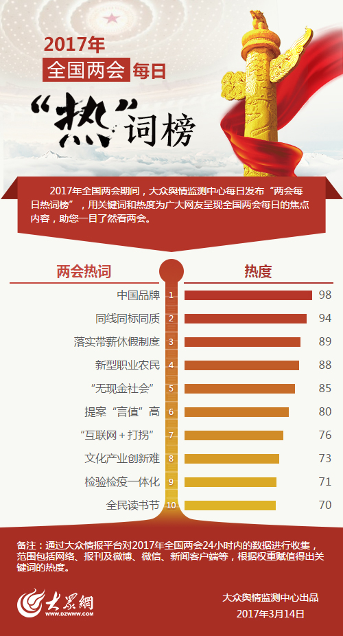 2017年全國兩會期間,大眾網(wǎng)將聯(lián)合大眾輿情監(jiān)測中心,每日發(fā)布“兩會每日熱詞榜”,通過大眾情報平臺,收集24小時內(nèi)的來自網(wǎng)絡(luò)、報刊,微博、微信、新聞客戶端等平臺的數(shù)據(jù),通過關(guān)鍵詞和熱度的維度,為網(wǎng)友呈現(xiàn)全國兩會每日熱點內(nèi)容,助您一目了然看兩會。