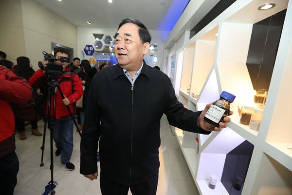 圣泉集團董事長唐一林向采訪團介紹石墨烯原料。