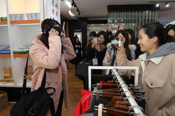 第十三屆中國網(wǎng)絡媒體山東行采訪團記者試戴石墨烯眼罩。