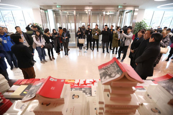 各種文學(xué)經(jīng)典著作、暢銷作品分類擺放,吸引不少記者駐足翻閱。