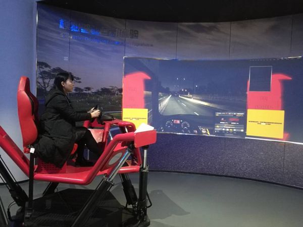 采訪團(tuán)記者在體驗(yàn)?zāi)M駕駛重卡。