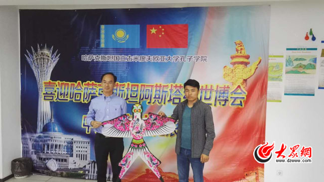 省政府新聞辦主任魏長(zhǎng)民(左)向哈薩克斯坦歐亞大學(xué)孔子學(xué)院贈(zèng)送非遺產(chǎn)品濰坊風(fēng)箏。